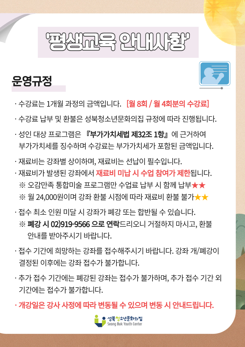 - 추가접수는 현장 접수만 가능하며, 폐강 및 재료비가 발생되는 강수가 제한될 수 있습니다.