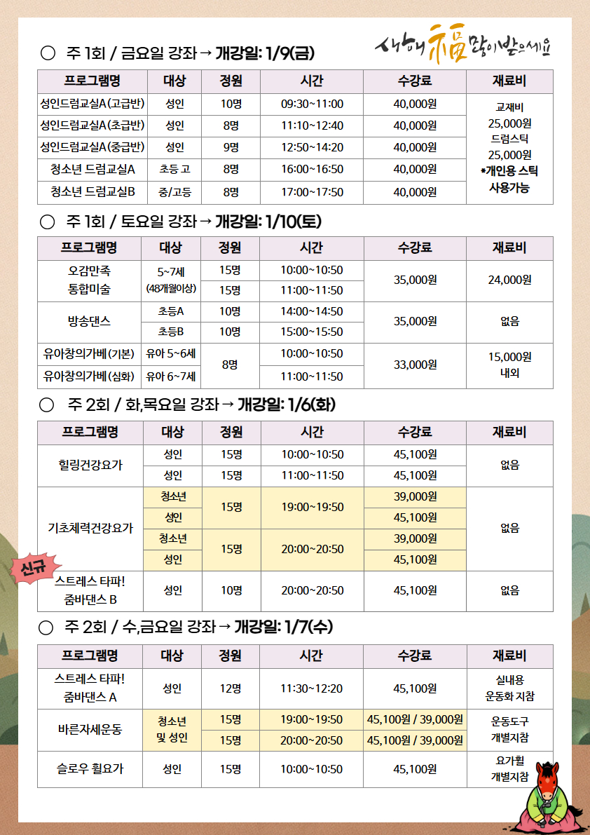 ○ '줌바댄스B' (화/목 20시) 강좌가 신규 개설되었으니 많은 관심과 참여 부탁드립니다.