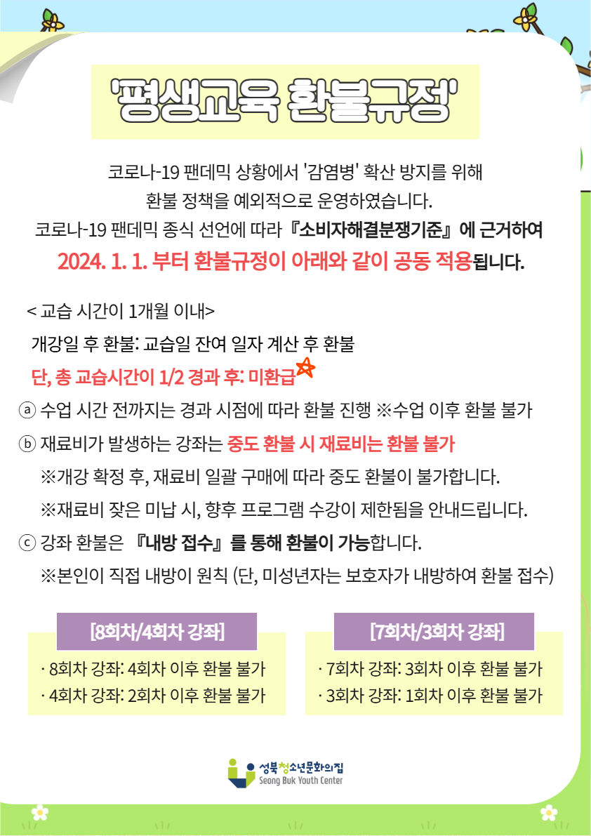 ⓒ 2024.1.1.부터 『소비자분쟁해결기준』에 근거하여 1/2 경과 후에는 수강료는 미환급됩니다.