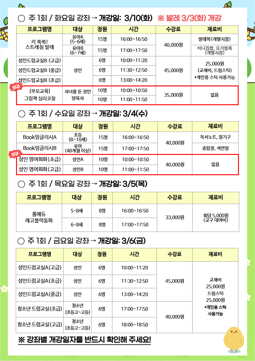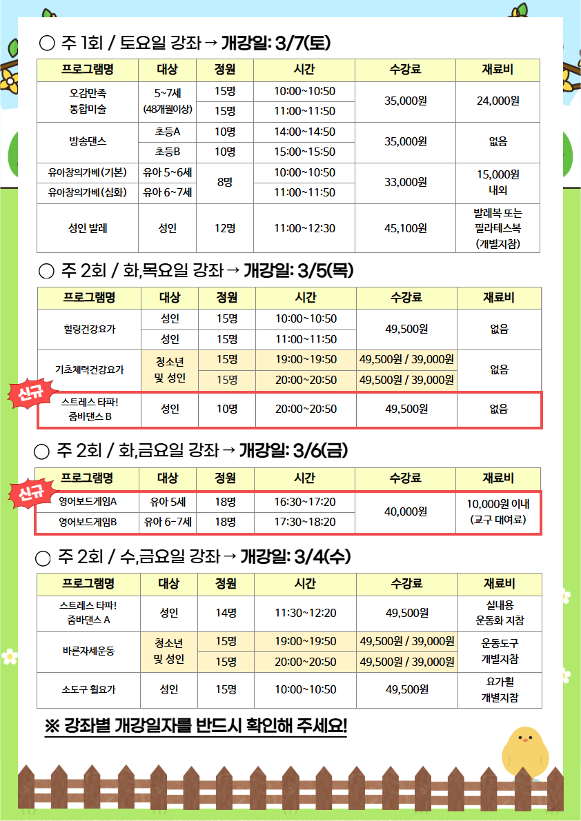 - 2/28(토)에 개/폐강이 결정되며, 폐강 이후에는 강좌 접수가 불가합니다.