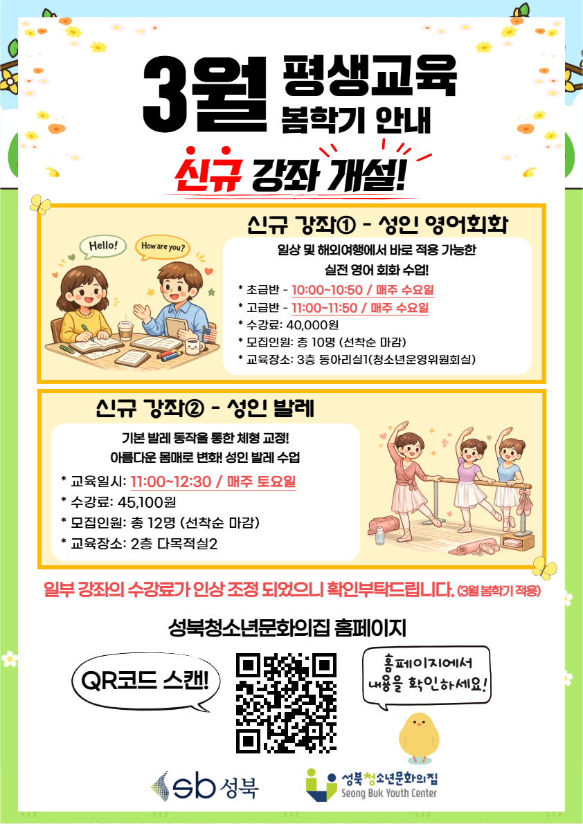 ○ 2026년 3월 봄학기 부터 일부 강좌의 수강료가 인상 조정된 부분이 있으니 확인 부탁드립니다.