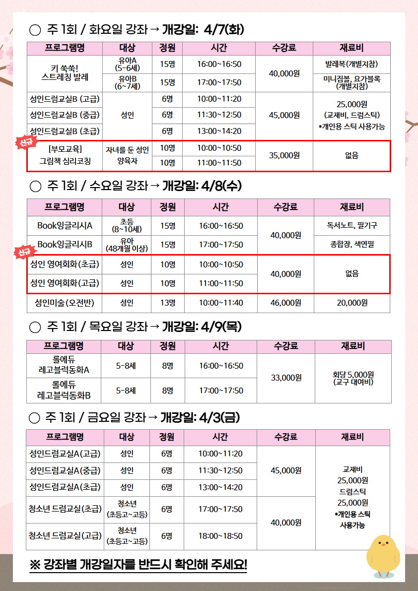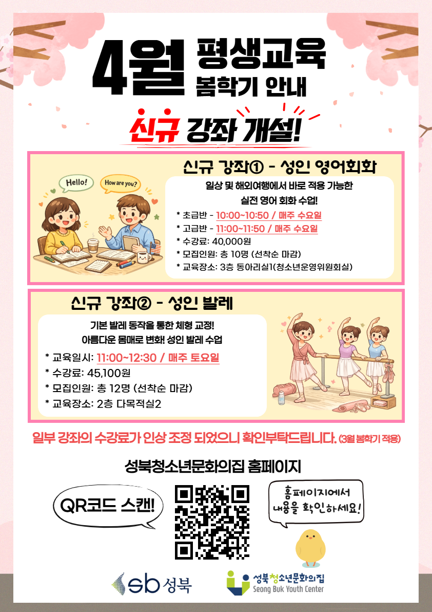 ○ 2026년 3월 봄학기 부터 일부 강좌의 수강료가 인상 조정된 부분이 있으니 확인 부탁드립니다.