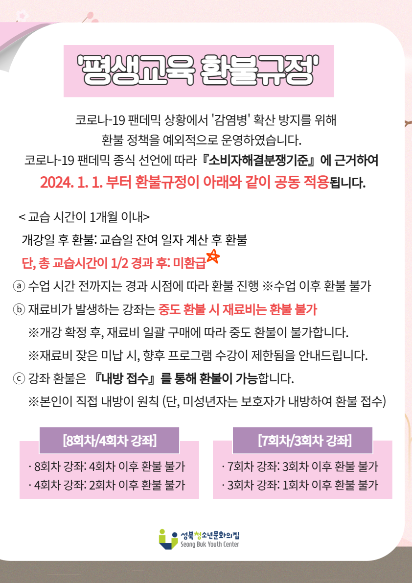 ⓒ 2024.1.1.부터 『소비자분쟁해결기준』에 근거하여 1/2 경과 후에는 수강료는 미환급됩니다.