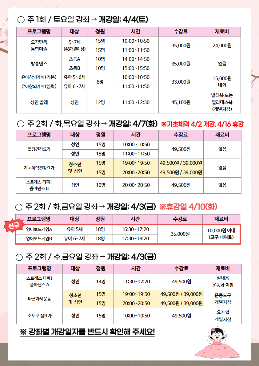 ○ 기초체력건강요가 수업은 4월 2일(목) 개강하며, 4월 16일(목)은 휴강입니다. 참고부탁드립니다.