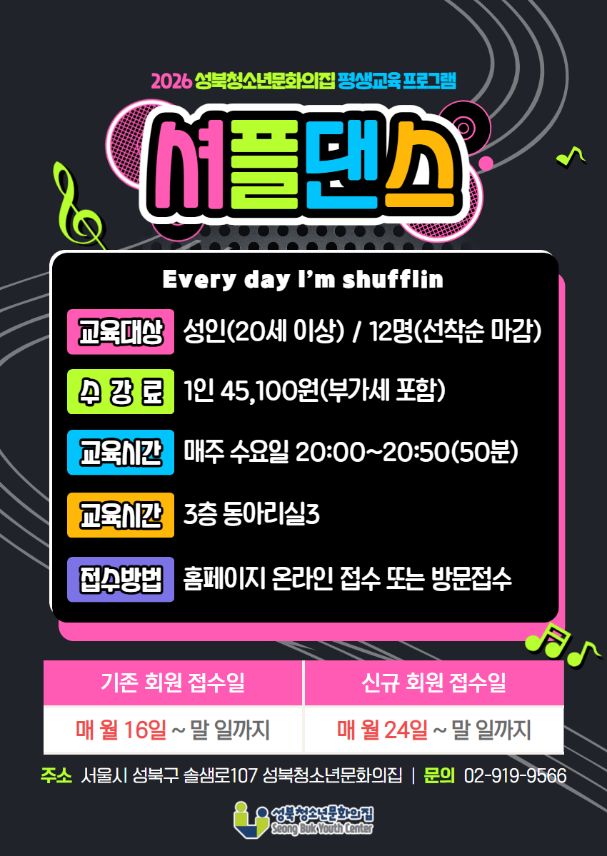 2026년 5월부터 새로운 평생교육 프로그램 '셔플댄스' 수업이 시작됩니다!